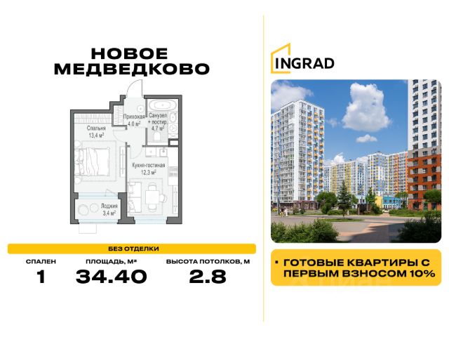 Прямая продажа от девелопера. В жилом квартале, расположенном в северо-западной части города Мытищи, продаётся 1-спальная квартира площадью 43.30 кв.м без отделки. Квартира расположена на 13 этаже 17-этажного дома, корпус 39, в жилом квартале комфорт-класса "Новое Медведково" (девелопер Ingrad). Расположение: Мытищи - один из ближайших спутников столицы, расположенный в живописной локации на северо-востоке Московской области в окружении лесопарков, водохранилищ и озер. Уровень развития социальной, торговой и культурной инфраструктуры города приближает его к Москве, но за счёт компактности самих Мытищ делает ещё удобнее. Отличная транспортная доступность: "Новое Медведково" возводится в северо-западной части города Мытищи в Микрорайоне 17А, всего в 6 км от МКАД, вблизи остановок общественного транспорта и в непосредственной близости от Пироговского лесопарка (400 м). 28 корпусов уже введены в эксплуатацию. Путь до Москвы по Волковскому шоссе составляет не более 10 минут. Добраться можно также на электричке - 20 минут по Ярославскому направлению до станции "Ядреево", на автобусе или маршрутке до станции метро "Медведково" менее, чем за полчаса. Инфраструктура: Комплексное развитие территории проекта "Новое Медведково" предполагает строительство полной собственной инфраструктуры одновременно с возведением жилых домов, которая будет включать в себя: Лингвистическую гимназию с 4 иностранными языками на 768 учеников (уже построена и работает), 5 детских садов общей емкостью 1 060 мест (два детский сада на 400 малышей построены и работают), Школу общей емкостью 1 735 мест, медицинский центр, Спортивный комплекс и многоуровневые парковки. Помещения под коммерческую инфраструктуру на первых (нежилых) этажах домов уже арендованы собственниками бизнеса: аптеки, магазины, супер- и минимаркеты, точки бытового и сервисного обслуживания, салоны красоты, пекарни, кондитерские, развивающие студии для детей. Купить 1-комнатную квартиру на 13 этаже в Мытищах.