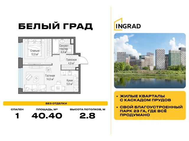 Пряма продажа от застройщика. В жилом квартале комфорт-класса "Белый Град" (застройщик ГК Инград) продаётся 1-спальная квартира площадью 34.90 кв.м без отделки. Квартира расположена на 6 этаже 23-этажного дома, корпус 12.3. Расположение: "Белый Град" расположен в благоприятном северном направлении Москвы: в комфортной близости ко всем ее возможностям. Вы будете жить в заповедном месте с благородной историей и красивой природой. Исторически у слияния двух рек - Сукромки и Яузы - на возвышении располагалось село Тайнинское. На протяжении веков оно было облюбовано царями и великими князьями. Белокаменный храм, которым вы будете любоваться в окнах своего нового дома, - уникальный памятник русского зодчества. Отличная транспортная доступность: Новый микрорайон находится в 1 км от МКАД и 500 м от Осташковского шоссе. Добраться до столицы можно не только на автомобиле: сеть общественного транспорта в районе квартала активно развивается и дополняется новыми маршрутами: 35 минут до метро "Медведково", 38 минут до ж/д станции "Мытищи". Особенности комплекса и благоустройство: Вы будете жить в заповедном месте с благородной историей на берегу реки Сукромки. Почти 40% площади квартала занимает благоустроенная природная территория. У каждого из трех кварталов своё тематическое наполнение. Функциональная насыщенность территории многообразна: сенсорные площадки и песочницы для малышей, отдельные развивающие игровые зоны для детей от 3 до 5 и от 5 до 11 лет, игровые зоны для подростков. Отдельный парк для тренировки и выгула собак. Зона воркаута с современными тренажерами и многофункциональные спортивные площадки для командных видов спорта, поляны для йоги, навесы с зонами для тихого отдыха, веломаршрут протяженностью более 5 километров. Социальная инфраструктура многогранна: включает 4 детских сада, две школы, поликлинику и физкультурно-оздоровительный комплекс с бассейном, торговый центр и 2 административно-офисных здания. Открытые многоуровневые паркинги по периферии кварталов и паркинг в стилобатной части освободят дворы от машин, велопарковки позволят не заставлять красивые холлы Стоимость квартиры - 7 450 000 Р. Срок сдачи - 3 квартал 2026. Более подробную информацию по объекту уточняйте по телефону и в отделе продаж.