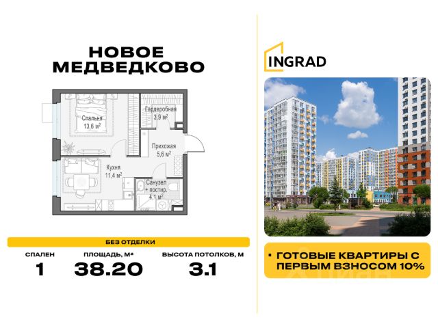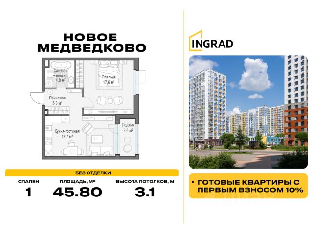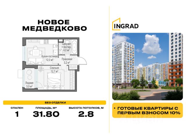 Прямая продажа от девелопера. В жилом квартале, расположенном в северо-западной части города Мытищи, продаётся 1-спальная квартира площадью 33.20 кв.м без отделки. Квартира расположена на 8 этаже 17-этажного дома, корпус 39, в жилом квартале комфорт-класса "Новое Медведково" (девелопер Ingrad). Расположение: Мытищи - один из ближайших спутников столицы, расположенный в живописной локации на северо-востоке Московской области в окружении лесопарков, водохранилищ и озер. Уровень развития социальной, торговой и культурной инфраструктуры города приближает его к Москве, но за счёт компактности самих Мытищ делает ещё удобнее. Отличная транспортная доступность: "Новое Медведково" возводится в северо-западной части города Мытищи в Микрорайоне 17А, всего в 6 км от МКАД, вблизи остановок общественного транспорта и в непосредственной близости от Пироговского лесопарка (400 м). 28 корпусов уже введены в эксплуатацию. Путь до Москвы по Волковскому шоссе составляет не более 10 минут. Добраться можно также на электричке - 20 минут по Ярославскому направлению до станции "Ядреево", на автобусе или маршрутке до станции метро "Медведково" менее, чем за полчаса. Инфраструктура: Комплексное развитие территории проекта "Новое Медведково" предполагает строительство полной собственной инфраструктуры одновременно с возведением жилых домов, которая будет включать в себя: Лингвистическую гимназию с 4 иностранными языками на 768 учеников (уже построена и работает), 5 детских садов общей емкостью 1 060 мест (два детский сада на 400 малышей построены и работают), Школу общей емкостью 1 735 мест, медицинский центр, Спортивный комплекс и многоуровневые парковки. Помещения под коммерческую инфраструктуру на первых (нежилых) этажах домов уже арендованы собственниками бизнеса: аптеки, магазины, супер- и минимаркеты, точки бытового и сервисного обслуживания, салоны красоты, пекарни, кондитерские, развивающие студии для детей. Продам 1-комнатную квартиру в новостройке без отделки в Мытищах.