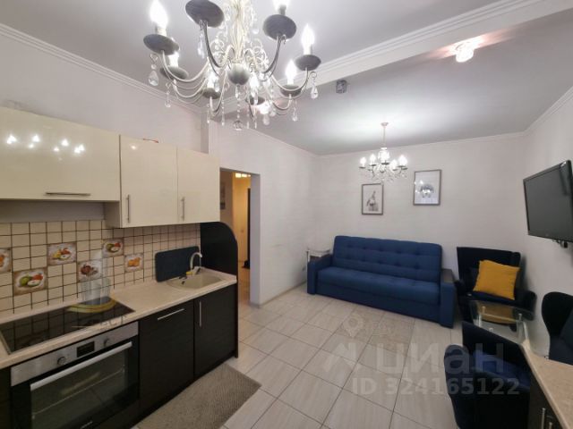Основу кухонного гарнитура составляют встроенные шкафы со светлым фасадом, за которым легко ухаживать. Встроенная бытовая техника: холодильник, посудомоечная машина, варочная панель, духовой шкаф, вытяжка - практически незаметны и сливаются с общим фоном, создавая ощущение простора. Есть раскладной диван. Модель выбрана с учетом компактности и функционала: в раскладном виде он образует полноценную кровать, а в сложенном - удобное место для отдыха. Напротив дивана размещен большой телевизор с современной звуковой системой.