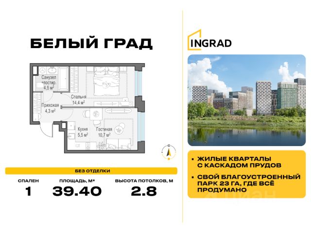 Пряма продажа от застройщика. В жилом квартале комфорт-класса "Белый Град" (застройщик ГК Инград) продаётся 1-спальная квартира площадью 40.60 кв.м без отделки. Квартира расположена на 6 этаже 20-этажного дома, корпус 12.2. Расположение: "Белый Град" расположен в благоприятном северном направлении Москвы: в комфортной близости ко всем ее возможностям. Вы будете жить в заповедном месте с благородной историей и красивой природой. Исторически у слияния двух рек - Сукромки и Яузы - на возвышении располагалось село Тайнинское. На протяжении веков оно было облюбовано царями и великими князьями. Белокаменный храм, которым вы будете любоваться в окнах своего нового дома, - уникальный памятник русского зодчества. Отличная транспортная доступность: Новый микрорайон находится в 1 км от МКАД и 500 м от Осташковского шоссе. Добраться до столицы можно не только на автомобиле: сеть общественного транспорта в районе квартала активно развивается и дополняется новыми маршрутами: 35 минут до метро "Медведково", 38 минут до ж/д станции "Мытищи". Особенности комплекса и благоустройство: Вы будете жить в заповедном месте с благородной историей на берегу реки Сукромки. Почти 40% площади квартала занимает благоустроенная природная территория. У каждого из трех кварталов своё тематическое наполнение. Функциональная насыщенность территории многообразна: сенсорные площадки и песочницы для малышей, отдельные развивающие игровые зоны для детей от 3 до 5 и от 5 до 11 лет, игровые зоны для подростков. Отдельный парк для тренировки и выгула собак. Зона воркаута с современными тренажерами и многофункциональные спортивные площадки для командных видов спорта, поляны для йоги, навесы с зонами для тихого отдыха, веломаршрут протяженностью более 5 километров. Социальная инфраструктура многогранна: включает 4 детских сада, две школы, поликлинику и физкультурно-оздоровительный комплекс с бассейном, торговый центр и 2 административно-офисных здания. Открытые многоуровневые паркинги по периферии кварталов и паркинг в стилобатной части освободят дворы от машин, велопарковки позволят не заставлять красивые холлы Стоимость квартиры - 7 720 000 Р. Срок сдачи - 3 квартал 2026. Более подробную информацию по объекту уточняйте по телефону и в отделе продаж.