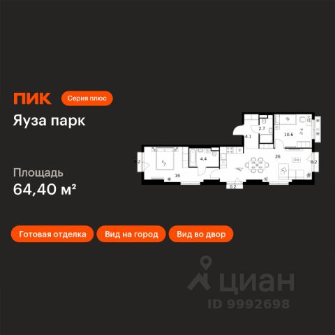 Продаётся 2-комн. квартира площадью 64,4 кв.м на 10 этаже 15 этажного дома (Корпус 13, Секция 3) проекта ПИК Яуза парк. Светлый просторный подъезд на уровне земли, функциональная планировка, большие окна, c отделкой. Жилой квартал "Яуза парк" возводится в Мытищах, в 5 минутах ходьбы от одноимённой ж/д станции. Проект включает 20 домов разной этажности с благоустроенными дворами-парками. Сейчас в квартале началось строительство новых корпусов 7-12. Это отличная возможность купить квартиру по стартовой цене. Индивидуальный дизайн фасадов разработали архитектурные бюро KATARSIS и RHIZOME. Вблизи жилого квартала появятся шумопоглощающие экраны, позволяющие забыть о том, что неподалёку находятся железнодорожные пути. На первых этажах домов откроются магазины, кафе, салоны красоты и другие полезные сервисы. Рядом есть школы и детские сады, магазины и ТРЦ "Красный кит". На территории проекта появится благоустроенная набережная реки Яузы и пешеходный бульвар для прогулок всей семьёй. Водонапорную башню XIX века, расположенную на территории "Яуза парка", мы реставрируем и создадим вокруг неё общественное пространство для отдыха жителей квартала. Для прогулок отлично подойдёт Мытищинский центральный парк культуры и отдыха, расположенный в 10 минутах ходьбы, и Лосиный остров — в 24 минутах. Дорога на автомобиле до Ярославского шоссе займёт не более 3 минут, до МКАД — 10 минут. Артикул 1057718 (Застройщик ООО "Специализированный "НМ-Консалт")