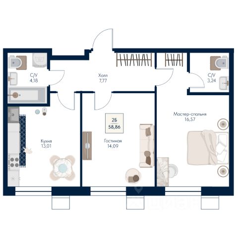 Продаётся 2-комнатная квартира в строящемся доме (Секции 1-5), срок сдачи: III-кв. 2028, общей площадью 58.86 кв.м., на 10 этаже. Новый жилой комплекс "Бархат" от застройщика "СЗ Глобалмытищи" расположен по адресу: г. Мытищи, Ядреевская улица.