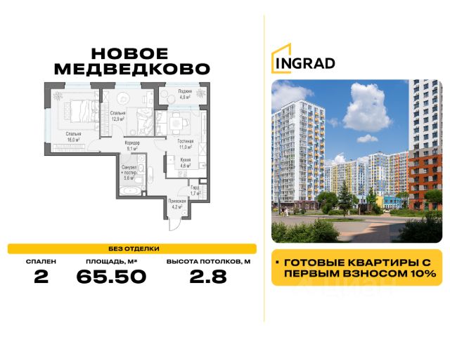 Прямая продажа от девелопера. В жилом квартале, расположенном в северо-западной части города Мытищи, продаётся 2-спальная квартира площадью 62.80 кв.м без отделки. Квартира расположена на 16 этаже 17-этажного дома, корпус 39, в жилом квартале комфорт-класса "Новое Медведково" (девелопер Ingrad). Расположение: Мытищи - один из ближайших спутников столицы, расположенный в живописной локации на северо-востоке Московской области в окружении лесопарков, водохранилищ и озер. Уровень развития социальной, торговой и культурной инфраструктуры города приближает его к Москве, но за счёт компактности самих Мытищ делает ещё удобнее. Отличная транспортная доступность: "Новое Медведково" возводится в северо-западной части города Мытищи в Микрорайоне 17А, всего в 6 км от МКАД, вблизи остановок общественного транспорта и в непосредственной близости от Пироговского лесопарка (400 м). 28 корпусов уже введены в эксплуатацию. Путь до Москвы по Волковскому шоссе составляет не более 10 минут. Добраться можно также на электричке - 20 минут по Ярославскому направлению до станции "Ядреево", на автобусе или маршрутке до станции метро "Медведково" менее, чем за полчаса. Инфраструктура: Комплексное развитие территории проекта "Новое Медведково" предполагает строительство полной собственной инфраструктуры одновременно с возведением жилых домов, которая будет включать в себя: Лингвистическую гимназию с 4 иностранными языками на 768 учеников (уже построена и работает), 5 детских садов общей емкостью 1 060 мест (два детский сада на 400 малышей построены и работают), Школу общей емкостью 1 735 мест, медицинский центр, Спортивный комплекс и многоуровневые парковки. Помещения под коммерческую инфраструктуру на первых (нежилых) этажах домов уже арендованы собственниками бизнеса: аптеки, магазины, супер- и минимаркеты, точки бытового и сервисного обслуживания, салоны красоты, пекарни, кондитерские, развивающие студии для детей.
