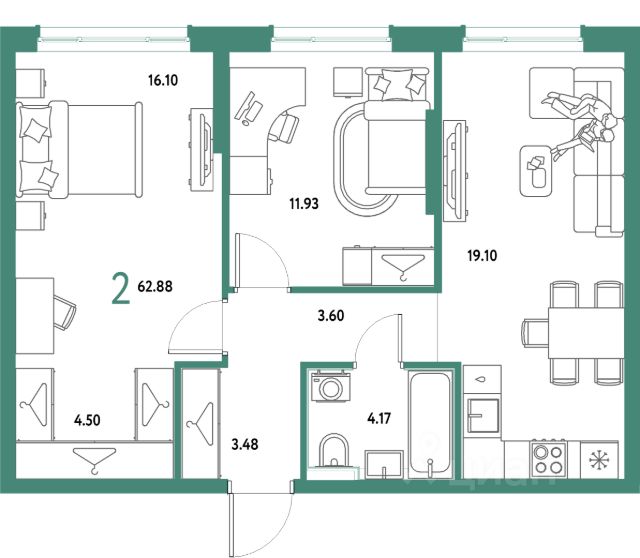 Квартира находится на 9 этаже 17 этажного монолитно кирпичного дома. Общая площадь квартиры 64,7 кв.м. Прихожая 8,3 кв.м, просторная кухня 15,8 кв.м, комнаты 14,6/14,7 кв.м, санузел, гардеробная, лоджия.