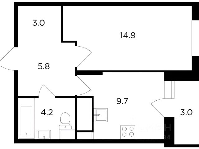 Санузел раздельный,туалетная комната,в которой размещены стиральная машинка, тумба с раковиной и зеркалом, в ванной комнате оборудована душевая, в которой предусмотрены достаточно большие полки для всякой необходимой приятной мелочи. Лоджия площадью 3 кв.м. остеклена, напольное покрытие - плитка, подготовлена электрическая проводка для освещения лоджии.