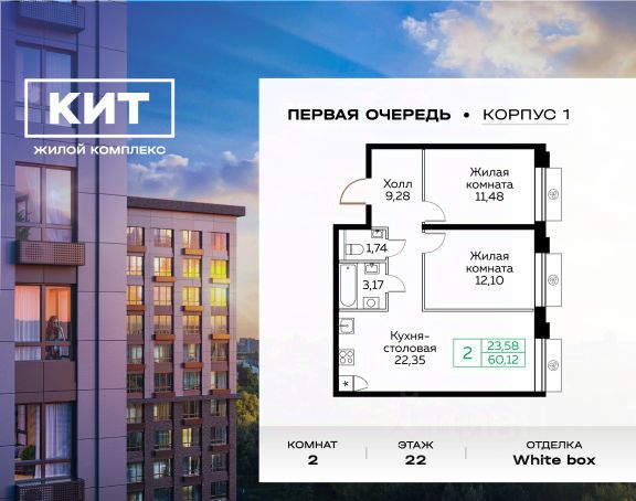 Дом сдан. Выдаем ключи! Продаётся 2-к квартира 60.2 кв.м. с чистовой отделкой в ЖК "КИТ" на 22-м этаже 25 этажного дома. Жилой комплекс "Кит" спроектирован в урбанистической концепции "Город в Городе". Объект бизнес-класса предлагает рациональный подход к набору опций, необходимых для гармоничной жизни. Проект представляет собой два корпуса, которые образуют единую приватную территорию. Ее доминантой является двор с красивым ландшафтным дизайном и различными зонами, ориентированными на интересы жителей разного возраста. При создании пространства в приоритет ставился комфорт жителей. В шаговой доступности находятся торговый центр, рестораны, кинотеатры, спортивный зал, образовательные учреждения и много других сфер услуг. Преимущества проекта: - Видовые характеристики (просматриваются Москва - Сити и Останкинская телебашня) - Широкая квартирография по всем типам квартир - Увеличенное остекление - 3 варианта отделки: без отделки, white box или чистовая отделка в скандинавском и итальянском стилях - Школа и детский сад рядом - Богатая развлекательная инфраструктура - Высокий уровень безопасности территории Расположение комплекса: - 5 минут пешком до ж/д "Мытищи" и автовокзала: - 19 минут до станции м. "Комсомольская" - 30 минут до станции м. "Медведково" - 2,2 км до Волковского шоссе - 2,8 км до Ярославского шоссе - 5,7 км до МКАД Продам 2-комнатную квартиру на проспекте Новомытищинский в городе Мытищи.