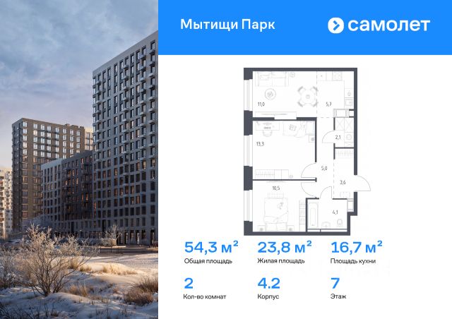 Строим кварталы для жизни с заботой о будущем. Предлагается 2-комнатная квартира комфорт-класса 50,1 кв.м в корпусе 4.2 на 7 этаже, в ЖК "Мытищи Парк" Квартира с чистовой отделкой. Доступность дополнительных опций уточняйте у застройщика. Приобрести квартиру возможно по специальным акциям от застройщика, с текущими условиями акций можно ознакомиться в блоке "Акций". Цена динамическая и может отличаться, уточняйте актуальность у застройщика. ЖК "Мытищи Парк" — это надежные и долговечные монолитные корпуса. При проектировании домов и территории застройщик учел потребности жильцов всех возрастов — молодых пар, семей с детьми и пожилых людей. ЖК "Мытищи Парк" расположен в Московской области и с двух сторон окружен Пироговским лесопарком.