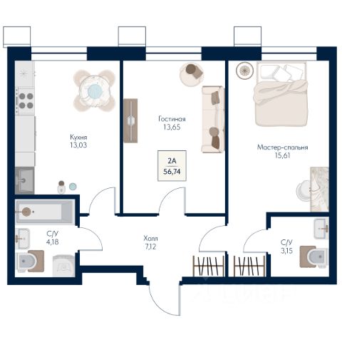 В большой комнате смонтирован шкаф купе на всю ширину комнаты глубиной 90 см, там же установлена сушильная машина на 8 кг. Комната разделена перегородкой на 2 зоны (спальня и место отдыха). Перегородка выполнена из пазогребневых плит толщиной 8 см, смонтированы полочки и диммируемая подсветка (можно делать ярче и тусклее). В комнате установлено 16 источников света, можно настроить как угодно. На стене подвесной стол/бар (выполнен на заказ), все ящики с авто доводчиками, телевизор с выдвижным кронштейном, полки. В маленькой комнате детская с встроенным шкафом и столом.