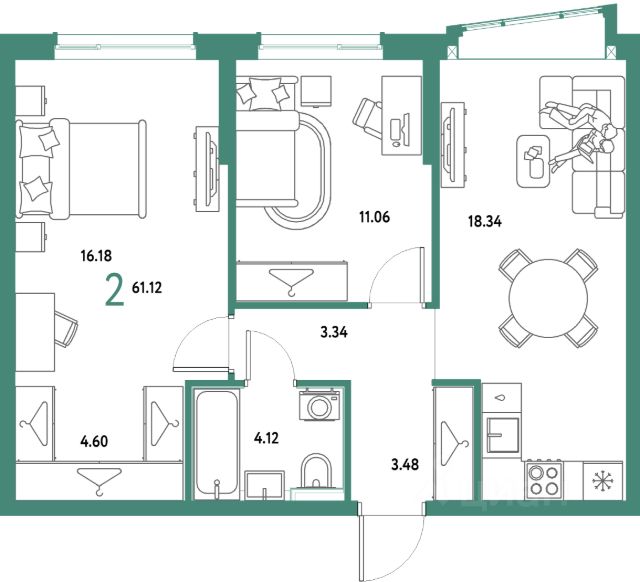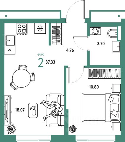 Удачная планировка квартиры, где будет много света за счет наличия трех больших окон и лоджией с окнами в пол.