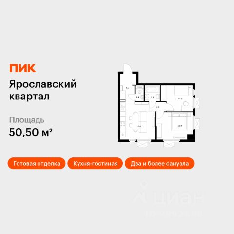 Продаётся 2-комн. квартира площадью 50,5 кв.м на 10 этаже 25 этажного дома (Корпус 1.4, Секция 1) проекта ПИК Ярославский квартал. Светлый просторный подъезд на уровне земли, функциональная планировка, большие окна, c отделкой. Проект "Ярославский квартал" возводится в Мытищах, в 6 км от МКАД. Жилой квартал, состоящий из 8 корпусов, строится рядом с Ярославским шоссе и имеет удобный заезд с крупной автомагистрали. На территории проекта появится школа, детский сад и пешеходный бульвар. Индивидуальные дизайны фасадов для "Ярославского квартала" разработало петербургское архитектурное бюро RHIZOME. В их портфолио вошли работы для Московского музея современного искусства, ГЦСИ, Манифеста 10 и ЦВЗ Манеж. За 7 минут можно дойти пешком до ближайшей автобусной остановки. Столько же займёт дорога до "Лосиного острова" - облагороженного парка с разными активностями для всей семьи, благоустроенными зонами для отдыха, местами для прогулок и пробежек на свежем воздухе. Доехать на автомобиле до Ярославского шоссе получится за 3 минуты, до станции "Мытищи" - за 9 минут, до МКАД - за 15 минут. Артикул 911419 (Застройщик ООО "Специализированный "ГЕОПАРК")