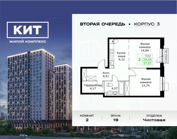Продаётся 2-к квартира 56.95 кв.м. с чистовой отделкой в ЖК "КИТ2" на 2-м этаже 25 этажного дома.Жилой комплекс "Кит 2" спроектирован в урбанистической концепции "Город в Городе". Объект бизнес-класса предлагает рациональный подход к набору опций, необходимых для гармоничной жизни. Проект представляет собой два корпуса, которые образуют единую приватную территорию. Ее доминантой является двор с красивым ландшафтным дизайном и различными зонами, ориентированными на интересы жителей разного возраста. При создании пространства в приоритет ставился комфорт жителей. В шаговой доступности находятся: торговый центр, рестораны, кинотеатры, спортивный зал, образовательные учреждения и множество других объектов в сфере услуг. Преимущества проекта: - 3 корпуса для приватной жизни - Видовые характеристики (просматриваются Москва - Сити и Останкинская телебашня) - Широкая квартирография по всем типам квартир - Увеличенное остекление - 3 варианта отделки: БОРДО, СТОКГОЛЬМ, ОСЛО - Богатая развлекательная инфраструктура - Высокий уровень безопасности территории Расположение комплекса: - 2,2 км до Волковского шоссе - 2,8 км до Ярославского шоссе - 5,7 км до МКАД - 5 минут пешком до ж/д станции "Мытищи" и Автовокзала - 18 минут до станции метро "Комсомольская" - 30 минут до станции метро "Медведково"