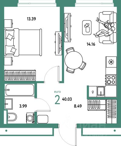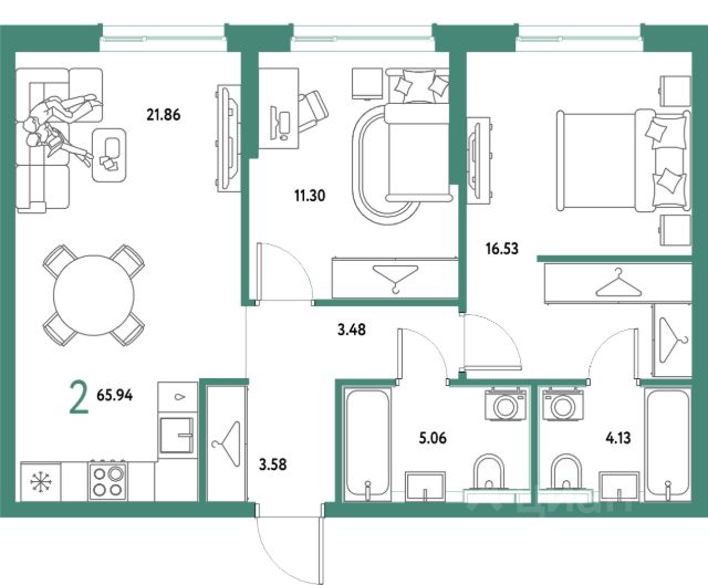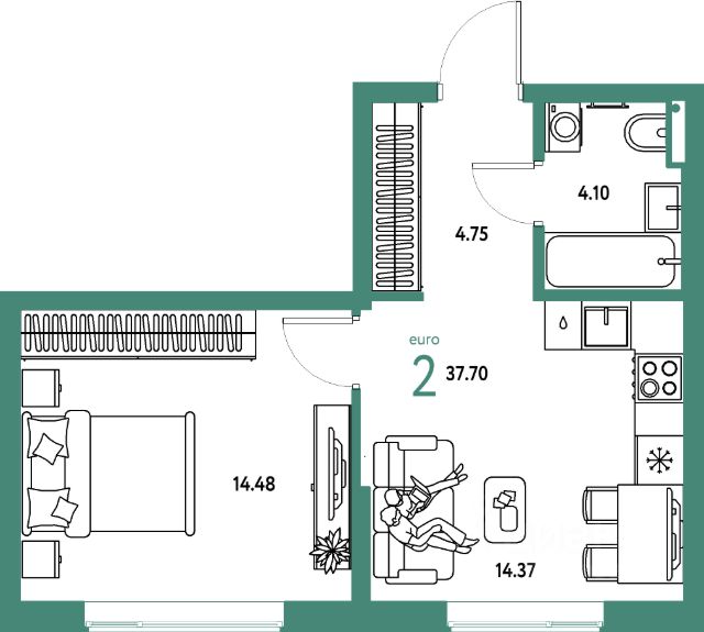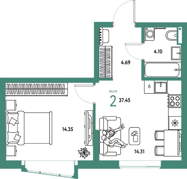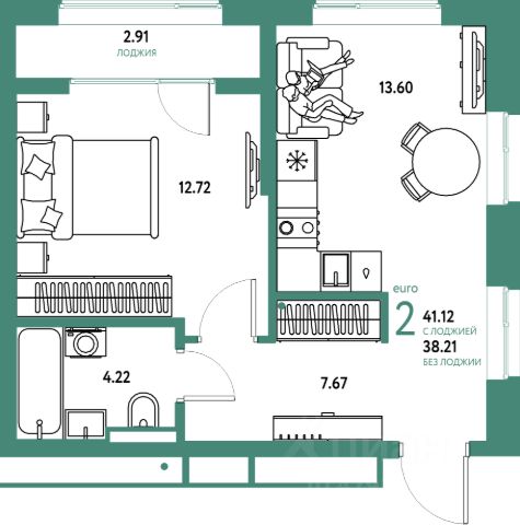 Удачная планировка квартиры, где будет много света за счет наличия трех больших окон и лоджией с окнами в пол.