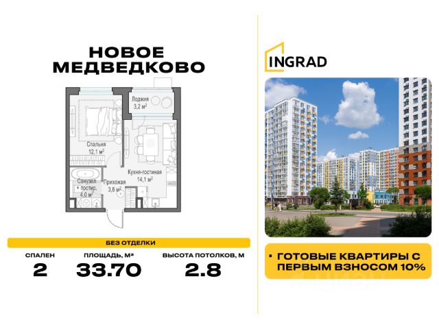 Прямая продажа от девелопера. В жилом квартале, расположенном в северо-западной части города Мытищи, продаётся 2-спальная квартира площадью 33.70 кв.м без отделки. Квартира расположена на 8 этаже 15-этажного дома, корпус 35, в жилом квартале комфорт-класса "Новое Медведково" (девелопер Ingrad). Расположение: Мытищи - один из ближайших спутников столицы, расположенный в живописной локации на северо-востоке Московской области в окружении лесопарков, водохранилищ и озер. Уровень развития социальной, торговой и культурной инфраструктуры города приближает его к Москве, но за счёт компактности самих Мытищ делает ещё удобнее. Отличная транспортная доступность: "Новое Медведково" возводится в северо-западной части города Мытищи в Микрорайоне 17А, всего в 6 км от МКАД, вблизи остановок общественного транспорта и в непосредственной близости от Пироговского лесопарка (400 м). 28 корпусов уже введены в эксплуатацию. Путь до Москвы по Волковскому шоссе составляет не более 10 минут. Добраться можно также на электричке - 20 минут по Ярославскому направлению до станции "Ядреево", на автобусе или маршрутке до станции метро "Медведково" менее, чем за полчаса. Инфраструктура: Комплексное развитие территории проекта "Новое Медведково" предполагает строительство полной собственной инфраструктуры одновременно с возведением жилых домов, которая будет включать в себя: Лингвистическую гимназию с 4 иностранными языками на 768 учеников (уже построена и работает), 5 детских садов общей емкостью 1 060 мест (два детский сада на 400 малышей построены и работают), Школу общей емкостью 1 735 мест, медицинский центр, Спортивный комплекс и многоуровневые парковки. Помещения под коммерческую инфраструктуру на первых (нежилых) этажах домов уже арендованы собственниками бизнеса: аптеки, магазины, супер- и минимаркеты, точки бытового и сервисного обслуживания, салоны красоты, пекарни, кондитерские, развивающие студии для детей.