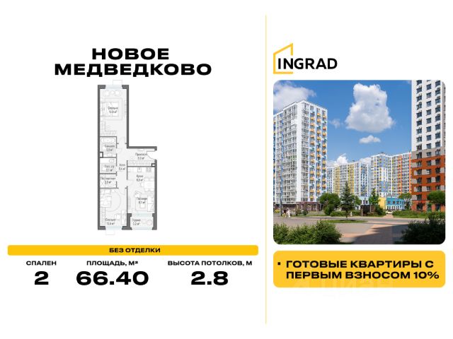Прямая продажа от девелопера. В жилом квартале, расположенном в северо-западной части города Мытищи, продаётся 2-спальная квартира площадью 66.40 кв.м без отделки. Квартира расположена на 13 этаже 15-этажного дома, корпус 35, в жилом квартале комфорт-класса "Новое Медведково" (девелопер Ingrad). Расположение: Мытищи - один из ближайших спутников столицы, расположенный в живописной локации на северо-востоке Московской области в окружении лесопарков, водохранилищ и озер. Уровень развития социальной, торговой и культурной инфраструктуры города приближает его к Москве, но за счёт компактности самих Мытищ делает ещё удобнее. Отличная транспортная доступность: "Новое Медведково" возводится в северо-западной части города Мытищи в Микрорайоне 17А, всего в 6 км от МКАД, вблизи остановок общественного транспорта и в непосредственной близости от Пироговского лесопарка (400 м). 28 корпусов уже введены в эксплуатацию. Путь до Москвы по Волковскому шоссе составляет не более 10 минут. Добраться можно также на электричке - 20 минут по Ярославскому направлению до станции "Ядреево", на автобусе или маршрутке до станции метро "Медведково" менее, чем за полчаса. Инфраструктура: Комплексное развитие территории проекта "Новое Медведково" предполагает строительство полной собственной инфраструктуры одновременно с возведением жилых домов, которая будет включать в себя: Лингвистическую гимназию с 4 иностранными языками на 768 учеников (уже построена и работает), 5 детских садов общей емкостью 1 060 мест (два детский сада на 400 малышей построены и работают), Школу общей емкостью 1 735 мест, медицинский центр, Спортивный комплекс и многоуровневые парковки. Помещения под коммерческую инфраструктуру на первых (нежилых) этажах домов уже арендованы собственниками бизнеса: аптеки, магазины, супер- и минимаркеты, точки бытового и сервисного обслуживания, салоны красоты, пекарни, кондитерские, развивающие студии для детей.