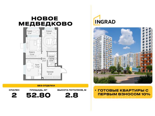 Прямая продажа от девелопера. В жилом квартале, расположенном в северо-западной части города Мытищи, продаётся 2-спальная квартира площадью 52.80 кв.м без отделки. Квартира расположена на 9 этаже 11-этажного дома, корпус 35, в жилом квартале комфорт-класса "Новое Медведково" (девелопер Ingrad). Расположение: Мытищи - один из ближайших спутников столицы, расположенный в живописной локации на северо-востоке Московской области в окружении лесопарков, водохранилищ и озер. Уровень развития социальной, торговой и культурной инфраструктуры города приближает его к Москве, но за счёт компактности самих Мытищ делает ещё удобнее. Отличная транспортная доступность: "Новое Медведково" возводится в северо-западной части города Мытищи в Микрорайоне 17А, всего в 6 км от МКАД, вблизи остановок общественного транспорта и в непосредственной близости от Пироговского лесопарка (400 м). 28 корпусов уже введены в эксплуатацию. Путь до Москвы по Волковскому шоссе составляет не более 10 минут. Добраться можно также на электричке - 20 минут по Ярославскому направлению до станции "Ядреево", на автобусе или маршрутке до станции метро "Медведково" менее, чем за полчаса. Инфраструктура: Комплексное развитие территории проекта "Новое Медведково" предполагает строительство полной собственной инфраструктуры одновременно с возведением жилых домов, которая будет включать в себя: Лингвистическую гимназию с 4 иностранными языками на 768 учеников (уже построена и работает), 5 детских садов общей емкостью 1 060 мест (два детский сада на 400 малышей построены и работают), Школу общей емкостью 1 735 мест, медицинский центр, Спортивный комплекс и многоуровневые парковки. Помещения под коммерческую инфраструктуру на первых (нежилых) этажах домов уже арендованы собственниками бизнеса: аптеки, магазины, супер- и минимаркеты, точки бытового и сервисного обслуживания, салоны красоты, пекарни, кондитерские, развивающие студии для детей. Продам 2-комнатную квартиру в Мытищах.