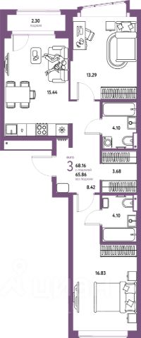 - Квартира расположена на 4 этаже, общая площадь составляет 70,8 кв. м, из которых 44,3 кв. м — жилая площадь, 9,6 кв.м кухня.