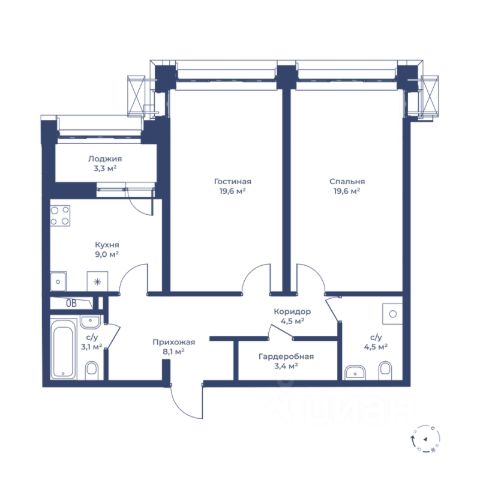 Высота потолков 2,7 метра и увеличенные окна наполняют пространство светом.