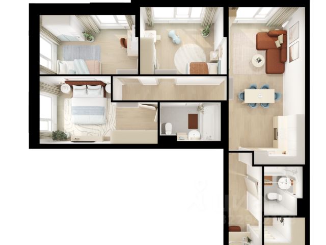 2 спальни, гостиная, кухня, гардеробная, просторный коридор, 2 с/у (один совмещен с гидромассажной ванной и душевой кабиной, второй с раковиной и гигиеническим душем).