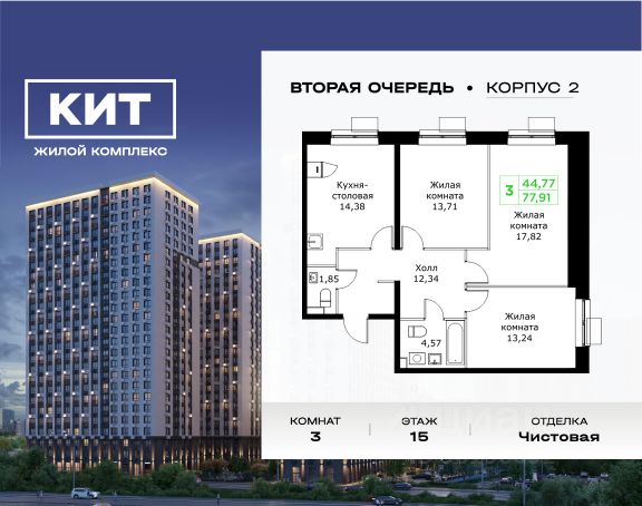 Продаётся 3-комн. квартира площадью 81,4 кв.м на 15 этаже 15 этажного дома (Корпус 13, Секция 3) проекта ПИК Яуза парк. Светлый просторный подъезд на уровне земли, функциональная планировка, большие окна, c отделкой. Жилой квартал "Яуза парк" возводится в Мытищах, в 5 минутах ходьбы от одноимённой ж/д станции. Проект включает 20 домов разной этажности с благоустроенными дворами-парками. Сейчас в квартале началось строительство новых корпусов 7-12. Это отличная возможность купить квартиру по стартовой цене. Индивидуальный дизайн фасадов разработали архитектурные бюро KATARSIS и RHIZOME. Вблизи жилого квартала появятся шумопоглощающие экраны, позволяющие забыть о том, что неподалёку находятся железнодорожные пути. На первых этажах домов откроются магазины, кафе, салоны красоты и другие полезные сервисы. Рядом есть школы и детские сады, магазины и ТРЦ "Красный кит". На территории проекта появится благоустроенная набережная реки Яузы и пешеходный бульвар для прогулок всей семьёй. Водонапорную башню XIX века, расположенную на территории "Яуза парка", мы реставрируем и создадим вокруг неё общественное пространство для отдыха жителей квартала. Для прогулок отлично подойдёт Мытищинский центральный парк культуры и отдыха, расположенный в 10 минутах ходьбы, и Лосиный остров — в 24 минутах. Дорога на автомобиле до Ярославского шоссе займёт не более 3 минут, до МКАД — 10 минут. Артикул 1057747 (Застройщик ООО "Специализированный "НМ-Консалт")