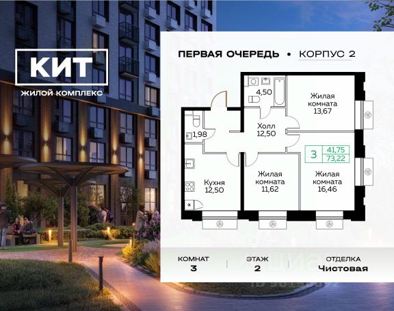 Дом сдан. Выдаем ключи! Продаётся 3-к квартира 73.2 кв.м. с чистовой отделкой в ЖК "КИТ" на 2-м этаже 25 этажного дома. Жилой комплекс "Кит" спроектирован в урбанистической концепции "Город в Городе". Объект бизнес-класса предлагает рациональный подход к набору опций, необходимых для гармоничной жизни. Проект представляет собой два корпуса, которые образуют единую приватную территорию. Ее доминантой является двор с красивым ландшафтным дизайном и различными зонами, ориентированными на интересы жителей разного возраста. При создании пространства в приоритет ставился комфорт жителей. В шаговой доступности находятся торговый центр, рестораны, кинотеатры, спортивный зал, образовательные учреждения и много других сфер услуг. Преимущества проекта: - Видовые характеристики (просматриваются Москва - Сити и Останкинская телебашня) - Широкая квартирография по всем типам квартир - Увеличенное остекление - 3 варианта отделки: без отделки, white box или чистовая отделка в скандинавском и итальянском стилях - Школа и детский сад рядом - Богатая развлекательная инфраструктура - Высокий уровень безопасности территории Расположение комплекса: - 5 минут пешком до ж/д "Мытищи" и автовокзала: - 19 минут до станции м. "Комсомольская" - 30 минут до станции м. "Медведково" - 2,2 км до Волковского шоссе - 2,8 км до Ярославского шоссе - 5,7 км до МКАД