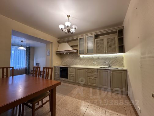 На кухне располагается угловой кухонный гарнитур, выполненный на заказ. Большое количество пространства для хранения, вместительные выдвижные ящики с металлическим каркасом, колонна под встроенный духовой шкаф (Zigmund & Shtain, сенсорный), ниша под холодильник (LIEBHERR), посудомоечная машина, удобная варочная панель нестандартных габаритов (Zigmund & Shtain, сенсорная), монолитная столешница из искусственного камня с интегрированной раковиной, фильтр для воды. Также, на кухне расположена обеденная зона и выход на лоджию, объединяющую два помещения.