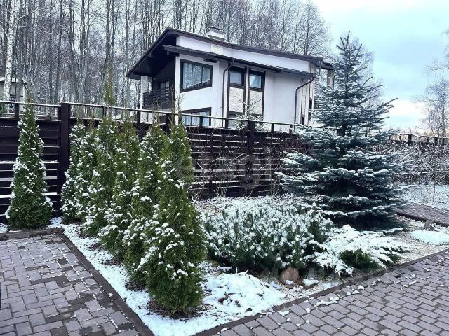На участке хвойные и плодовые деревья, альпийская горка, ландшафтный дизайн, парковка на 2 машины.