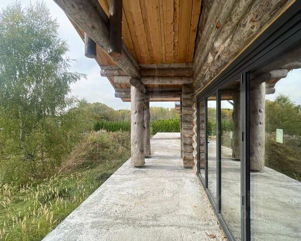 Из кухни столовой есть выход на большую крытую веранду, пристроенную к дому. Веранда полностью выполнена из лиственницы и имеет двухстороннее панорамное остекление. Веранда зрительно разбита на зону отдыха с камином мангалом и спортивную: тренажеры, настольный теннис.