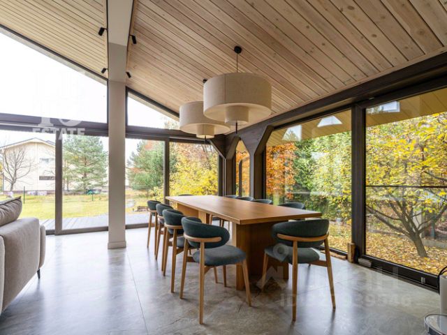 Дом расположен в одной из самых приватных частей поселка, рядом с прудом и примыкает к лесу, благодаря чему, из окон открывается шикарный вид на лесную чащу . Отлично спланированное внутреннее пространство позволяет разграничить общую семейную жизнь и приватные зоны.