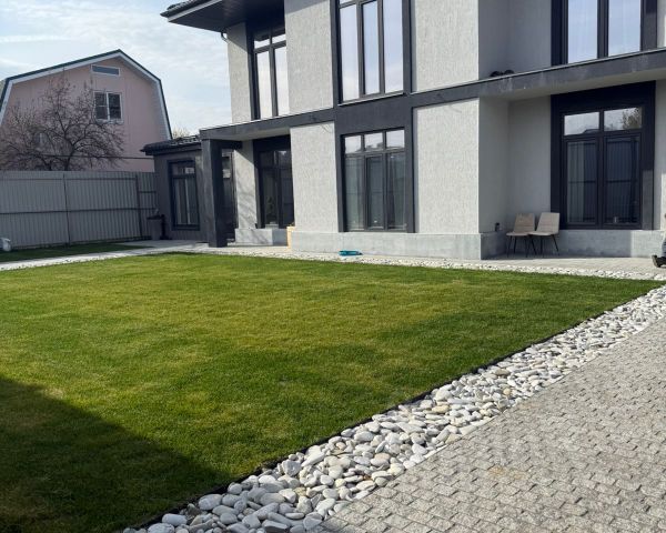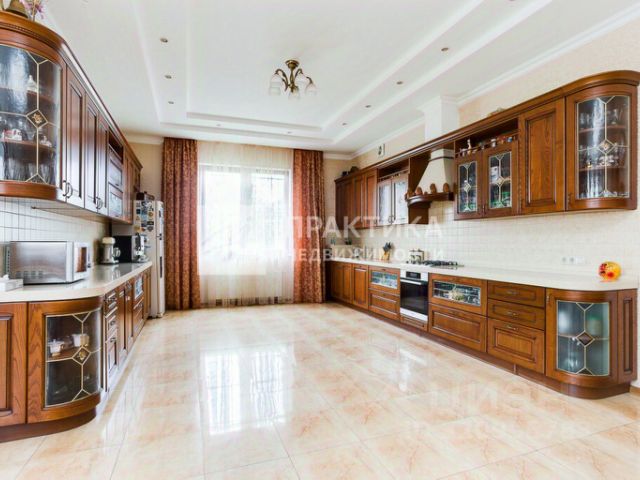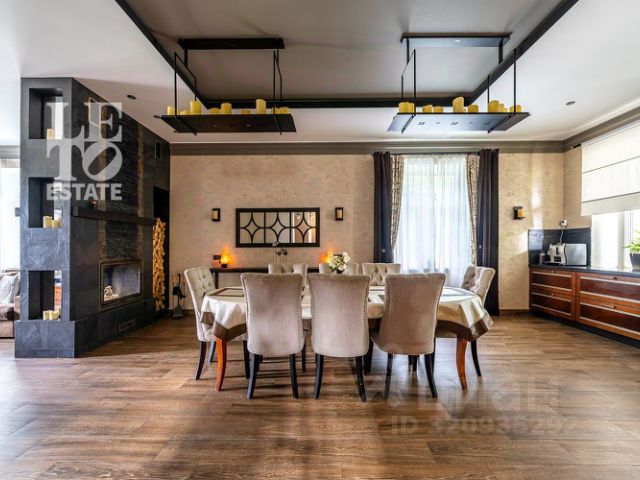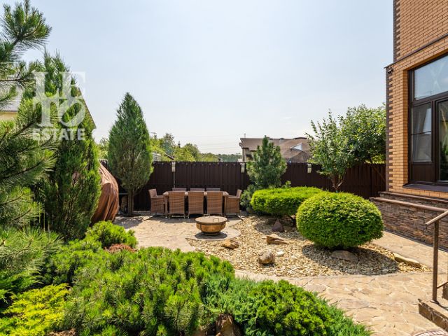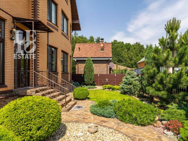 Дом 2013 года постройки, состоит из двух этажей, а также цокольного, полностью меблирован и готов к проживанию, ремонт выполнен из дорогих, высококачественных материалов. Центром притяжения в доме, является большой холл с массивной лестницей из кавказского дуба и вторым светом. Также дом располагает пятью спальнями, зимним садом с зоной барбекю и террасой, зоной СПА с бассейном и сауной, в мансарде расположен спортзал. Дом стоит на монолитно-ленточном фундаменте глубиной 2,4 м. В стоимость входит отдельно стоящее здание с гаражом на первом этаже и квартирой для персонала на втором этаже. Несколько уровней подготовки и очистки воды. Все коммуникации центральные, отопление газовым котлом, мощностью 60 кВт. На участке выполнен ландшафтный дизайн, дорожки вымощены тротуарной плиткой, высажены плодовые, а также хвойные деревья, дубы, кустарники, цветы, виноград. Украшает сад пруд с фонтаном и рыбками. Поселок под круглосуточной охраной. До Пироговского водохранилища 4 км.