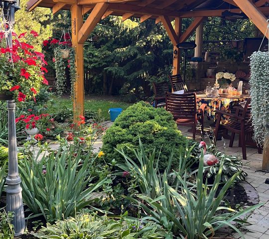 Территория вокруг дома практически целиком отдана под озеленение: деревья-крупномеры (кедры, сосны, ели ценных пород, огромные липы), плодовые деревья (калина, рябина, сирень, черемуха, вишня), много видов кустарников, цветущих поочередно в разное время года, сад из нескольких видов гортензий, пионов и рододендронов, чудесная крытая аллея, увитая девичьим виноградом - и это далеко не полный список. А большой размер участка - 60 соток - позволил также разместить на нем огромный газон для отдыха.