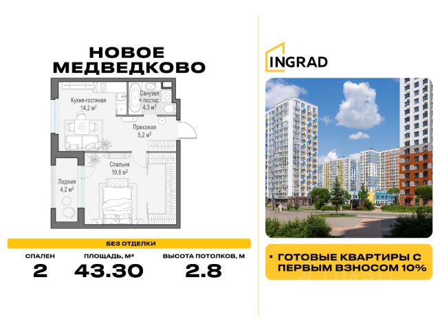 Прямая продажа от девелопера. В жилом квартале, расположенном в северо-западной части города Мытищи, продаётся 2-спальная квартира площадью 43.30 кв.м без отделки. Квартира расположена на 9 этаже 17-этажного дома, корпус 39, в жилом квартале комфорт-класса "Новое Медведково" (девелопер Ingrad). Расположение: Мытищи - один из ближайших спутников столицы, расположенный в живописной локации на северо-востоке Московской области в окружении лесопарков, водохранилищ и озер. Уровень развития социальной, торговой и культурной инфраструктуры города приближает его к Москве, но за счёт компактности самих Мытищ делает ещё удобнее. Отличная транспортная доступность: "Новое Медведково" возводится в северо-западной части города Мытищи в Микрорайоне 17А, всего в 6 км от МКАД, вблизи остановок общественного транспорта и в непосредственной близости от Пироговского лесопарка (400 м). 28 корпусов уже введены в эксплуатацию. Путь до Москвы по Волковскому шоссе составляет не более 10 минут. Добраться можно также на электричке - 20 минут по Ярославскому направлению до станции "Ядреево", на автобусе или маршрутке до станции метро "Медведково" менее, чем за полчаса. Инфраструктура: Комплексное развитие территории проекта "Новое Медведково" предполагает строительство полной собственной инфраструктуры одновременно с возведением жилых домов, которая будет включать в себя: Лингвистическую гимназию с 4 иностранными языками на 768 учеников (уже построена и работает), 5 детских садов общей емкостью 1 060 мест (два детский сада на 400 малышей построены и работают), Школу общей емкостью 1 735 мест, медицинский центр, Спортивный комплекс и многоуровневые парковки. Помещения под коммерческую инфраструктуру на первых (нежилых) этажах домов уже арендованы собственниками бизнеса: аптеки, магазины, супер- и минимаркеты, точки бытового и сервисного обслуживания, салоны красоты, пекарни, кондитерские, развивающие студии для детей.