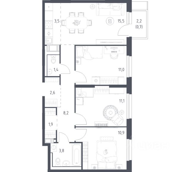 2 изолированные комнаты с проходом через просторный хол, делает их идеально звукоизолированными. Комнаты выходят на внешнюю и внутреннюю сторону дома. Большая кухня 15 м соединена с отдельной лоджией. В спальне отдельная шкафная комната. 4 й этаж , наличие 2 х лифтов делает комфортным доступ. Круглосуточные услуги вежливых консьержей и просторный подъезд.