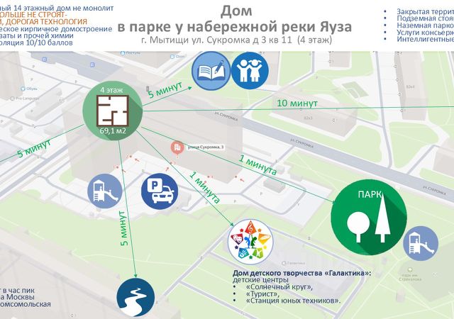 2 -х комнатная квартира 69,1 м2 в кирпичном Доме в Парке у Набережной. Единичное предложение в городе с такими характеристиками. Уникальное единственное в городе расположение дома непосредственно в Парке у набережной реки Яуза. Точечная застройка в старом обжитом , историческом месте. В Мытищах всего 4 парка, один из них центральный. И только в единственном Парке им космонавта Стрекалова стоит жилой дом. Больше таких мест в городе нет. Дом построен по классической технологии кирпичного домостроения. Будет стоять вечно и выглядеть как новый. Кирпич делает проживание- зимой тепло, летом прохладно. Не применяются ни какие утеплители и химия. За счет кирпича звукоизоляция в доме 10 из 10 баллов. Так как технология строительства из кирпича дорога, то такие дома больше не строятся. Дом расположен на закрытой территории, есть наземная парковка и подземный гараж. Отсутствие магазинов на первом этаже, отсутствие потока прохожих, делает дом камерного проживания. Проживающие в доме это коренные жители, среди которых много тех кто внес в развитие города существенный вклад. 40 минут до центра Москвы (метро проспект Мира) в час пик. Расположение дома по отношению к окружающей инфраструктуре получило самые максимальные оценки. В 3-7 минутной доступности 6 школ, 4 детских сада, 2 поликлиники, 1 ВУЗ, 3 продуктовых центра , а также Ледовый Дворец и самый большой термальный комплекс СПА с более чем 15 саун и 10 различных бассейнов, фитнес центр. Непосредственно в 50 метрах открылся Центр детского творчества в здании легендарного НИИОХ. Планировка квартиры, лучше не придумать. 2 изолированные комнаты с проходом через просторный хол, делает их идеально звукоизолированными. Комнаты выходят на внешнюю и внутреннюю сторону дома. Большая кухня 15 м соединена с отдельной лоджией. В спальне отдельная шкафная комната. 4 й этаж несмотря на наличие 2 х лифтов делает комфортным доступ. Круглосуточные услуги вежливых консьержей и просторный подъезд. На этажной площадке все так же малошумно 4 квартиры .Стоить отметить, что в доме завершены ремонты квартир, и это огромный плюс, этим дом существенно отличается от новостроек, где еще 10 лет все будет греметь и пылить. Подчеркнем дом находится в самом парке с доступностью к благоустроенной набережной реки Яуза со своими прогулочными комплексами. Квартира, для тех кто ценит статус, комфорт, соседское окружение, проживание в городской черте в максимально комфортной и лесной зоне . Тип дома: кирпичный Год постройки: 2001 Этажей в доме: 14 Пассажирский лифт: 1 Грузовой лифт: 1 В доме: консьерж, мусоропровод Двор: закрытая территория, детская площадка, спортивная площадка Парковка: подземная и открытая во дворе, Въезд в дом : шлагбаум Квартира готова к заселению. Прописанных нет. Один взрослый собственник.
