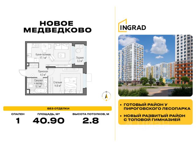 Прямая продажа от застройщика. В жилом квартале, расположенном в северо-западной части города Мытищи, продаётся 2-спальная квартира площадью 54.70 кв.м без отделки. Квартира расположена на 4 этаже 18-этажного дома, корпус 41, в жилом квартале комфорт-класса Новое Медведково (застройщик ГК Инград). Расположение: Мытищи - один из ближайших спутников столицы, расположенный в живописной локации на северо-востоке Московской области в окружении лесопарков, водохранилищ и озер. Уровень развития социальной, торговой и культурной инфраструктуры города приближает его к Москве, но за счёт компактности самих Мытищ делает ещё удобнее. Отличная транспортная доступность: "Новое Медведково" возводится в северо-западной части города Мытищи в Микрорайоне 17А, всего в 6 км от МКАД, вблизи остановок общественного транспорта и в непосредственной близости от Пироговского лесопарка (400 м). 28 корпусов уже введены в эксплуатацию. Путь до Москвы по Волковскому шоссе составляет не более 10 минут. Добраться можно также на электричке - 20 минут по Ярославскому направлению до станции "Ядреево", на автобусе или маршрутке до станции метро "Медведково" менее, чем за полчаса. Инфраструктура: Комплексное развитие территории проекта "Новое Медведково" предполагает строительство полной собственной инфраструктуры одновременно с возведением жилых домов, которая будет включать в себя: Лингвистическую гимназию с 4 иностранными языками на 768 учеников (уже построена и работает), 5 детских садов общей емкостью 1 060 мест (два детский сада на 400 малышей построены и работают), Школу общей емкостью 1 735 мест, медицинский центр, Спортивный комплекс и многоуровневые парковки. Помещения под коммерческую инфраструктуру на первых (нежилых) этажах домов уже арендованы собственниками бизнеса: аптеки, магазины, супер- и минимаркеты, точки бытового и сервисного обслуживания, салоны красоты, пекарни, кондитерские, развивающие студии для детей. Стоимость квартиры - 11 810 000 Р. Срок сдачи - 3 квартал 2025. Более подробную информацию по объекту уточняйте по телефону и в отделе продаж. Продается квартира в ипотеку в микрорайоне 17А в городе Мытищи.