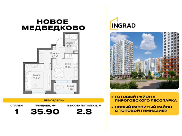 Прямая продажа от девелопера. В жилом квартале, расположенном в северо-западной части города Мытищи, продаётся 3-спальная квартира площадью 73.00 кв.м без отделки. Квартира расположена на 17 этаже 17-этажного дома, корпус 35, в жилом квартале комфорт-класса "Новое Медведково" (девелопер Ingrad). Расположение: Мытищи - один из ближайших спутников столицы, расположенный в живописной локации на северо-востоке Московской области в окружении лесопарков, водохранилищ и озер. Уровень развития социальной, торговой и культурной инфраструктуры города приближает его к Москве, но за счёт компактности самих Мытищ делает ещё удобнее. Отличная транспортная доступность: "Новое Медведково" возводится в северо-западной части города Мытищи в Микрорайоне 17А, всего в 6 км от МКАД, вблизи остановок общественного транспорта и в непосредственной близости от Пироговского лесопарка (400 м). 28 корпусов уже введены в эксплуатацию. Путь до Москвы по Волковскому шоссе составляет не более 10 минут. Добраться можно также на электричке - 20 минут по Ярославскому направлению до станции "Ядреево", на автобусе или маршрутке до станции метро "Медведково" менее, чем за полчаса. Инфраструктура: Комплексное развитие территории проекта "Новое Медведково" предполагает строительство полной собственной инфраструктуры одновременно с возведением жилых домов, которая будет включать в себя: Лингвистическую гимназию с 4 иностранными языками на 768 учеников (уже построена и работает), 5 детских садов общей емкостью 1 060 мест (два детский сада на 400 малышей построены и работают), Школу общей емкостью 1 735 мест, медицинский центр, Спортивный комплекс и многоуровневые парковки. Помещения под коммерческую инфраструктуру на первых (нежилых) этажах домов уже арендованы собственниками бизнеса: аптеки, магазины, супер- и минимаркеты, точки бытового и сервисного обслуживания, салоны красоты, пекарни, кондитерские, развивающие студии для детей. Стоимость квартиры - 23 020 000 Р. Срок сдачи - 4 квартал 2025. Более подробную информацию по объекту уточняйте по телефону и в отделе продаж.