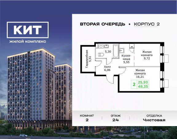 Дом сдан. Выдаем ключи! Продаётся 2-к квартира 54.7 кв.м. без отделки в ЖК "КИТ" на 8-м этаже 25 этажного дома. Жилой комплекс "Кит" спроектирован в урбанистической концепции "Город в Городе". Объект бизнес-класса предлагает рациональный подход к набору опций, необходимых для гармоничной жизни. Проект представляет собой два корпуса, которые образуют единую приватную территорию. Ее доминантой является двор с красивым ландшафтным дизайном и различными зонами, ориентированными на интересы жителей разного возраста. При создании пространства в приоритет ставился комфорт жителей. В шаговой доступности находятся торговый центр, рестораны, кинотеатры, спортивный зал, образовательные учреждения и много других сфер услуг. Преимущества проекта: - Видовые характеристики (просматриваются Москва - Сити и Останкинская телебашня) - Широкая квартирография по всем типам квартир - Увеличенное остекление - 3 варианта отделки: без отделки, white box или чистовая отделка в скандинавском и итальянском стилях - Школа и детский сад рядом - Богатая развлекательная инфраструктура - Высокий уровень безопасности территории Расположение комплекса: - 5 минут пешком до ж/д "Мытищи" и автовокзала: - 19 минут до станции м. "Комсомольская" - 30 минут до станции м. "Медведково" - 2,2 км до Волковского шоссе - 2,8 км до Ярославского шоссе - 5,7 км до МКАД Квартира в доме бизнес класса.
