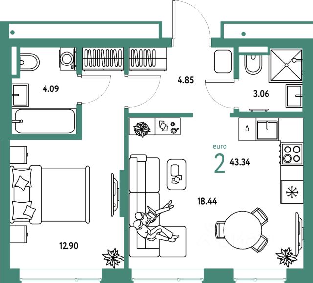 Удачная планировка квартиры, где будет много света за счет наличия трех больших окон и лоджией с окнами в пол.
