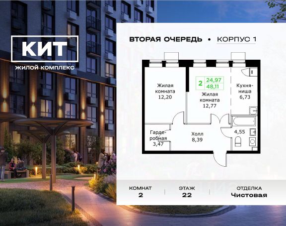 Продаётся 2-к квартира 43.84 кв.м. с чистовой отделкой в ЖК "КИТ2" на 6-м этаже 25 этажного дома.Жилой комплекс "Кит 2" спроектирован в урбанистической концепции "Город в Городе". Объект бизнес-класса предлагает рациональный подход к набору опций, необходимых для гармоничной жизни. Проект представляет собой два корпуса, которые образуют единую приватную территорию. Ее доминантой является двор с красивым ландшафтным дизайном и различными зонами, ориентированными на интересы жителей разного возраста. При создании пространства в приоритет ставился комфорт жителей. В шаговой доступности находятся: торговый центр, рестораны, кинотеатры, спортивный зал, образовательные учреждения и множество других объектов в сфере услуг. Преимущества проекта: - 3 корпуса для приватной жизни - Видовые характеристики (просматриваются Москва - Сити и Останкинская телебашня) - Широкая квартирография по всем типам квартир - Увеличенное остекление - 3 варианта отделки: БОРДО, СТОКГОЛЬМ, ОСЛО - Богатая развлекательная инфраструктура - Высокий уровень безопасности территории Расположение комплекса: - 2,2 км до Волковского шоссе - 2,8 км до Ярославского шоссе - 5,7 км до МКАД - 5 минут пешком до ж/д станции "Мытищи" и Автовокзала - 18 минут до станции метро "Комсомольская" - 30 минут до станции метро "Медведково"