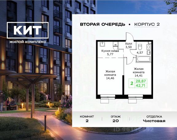 Дом сдан. Выдаем ключи! Продаётся 2-к квартира 55.2 кв.м. с чистовой отделкой в ЖК "КИТ" на 18-м этаже 25 этажного дома. Жилой комплекс "Кит" спроектирован в урбанистической концепции "Город в Городе". Объект бизнес-класса предлагает рациональный подход к набору опций, необходимых для гармоничной жизни. Проект представляет собой два корпуса, которые образуют единую приватную территорию. Ее доминантой является двор с красивым ландшафтным дизайном и различными зонами, ориентированными на интересы жителей разного возраста. При создании пространства в приоритет ставился комфорт жителей. В шаговой доступности находятся торговый центр, рестораны, кинотеатры, спортивный зал, образовательные учреждения и много других сфер услуг. Преимущества проекта: - Видовые характеристики (просматриваются Москва - Сити и Останкинская телебашня) - Широкая квартирография по всем типам квартир - Увеличенное остекление - 3 варианта отделки: без отделки, white box или чистовая отделка в скандинавском и итальянском стилях - Школа и детский сад рядом - Богатая развлекательная инфраструктура - Высокий уровень безопасности территории Расположение комплекса: - 5 минут пешком до ж/д "Мытищи" и автовокзала: - 19 минут до станции м. "Комсомольская" - 30 минут до станции м. "Медведково" - 2,2 км до Волковского шоссе - 2,8 км до Ярославского шоссе - 5,7 км до МКАД