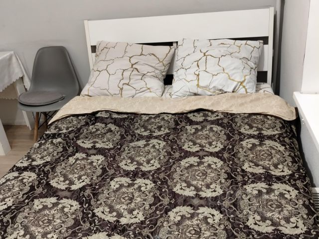 - Современная мебель в комнате : стол - трансформер, табуретки. стл обеденный - раселадной, диван раскладной двухспальный, телевизор, шторы-тюль, новые спальные и банные принадлежности.