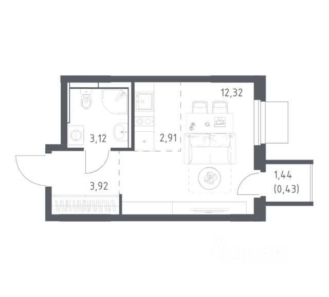 В продаже студия в корпусе 5 ЖК 'Мытищи Парк'. Квартира располагается на 12 этаже, общая площадь 22.7 м2.