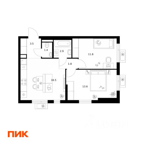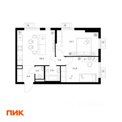 Продуманная планировка: Просторная кухня-гостиная 16 м², большие окна, функциональное пространство.