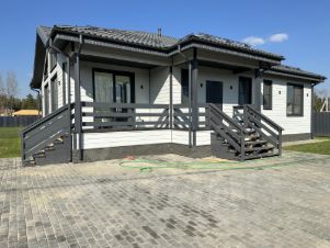 Поднимаясь на первый уровень, вы попадаете в просторный холл, который плавно перетекает в гостиную со вторым светом и высокими потолками. Рядом кухня-столовая с зоной отдыха и прямым выходом на участок, где можно наслаждаться свежим воздухом. Этот этаж дополняют гостевая спальня, светлая комната с панорамным остеклением, которая подойдет под кабинет или зимний сад, а также санузлы и постирочная для повседневного удобства.