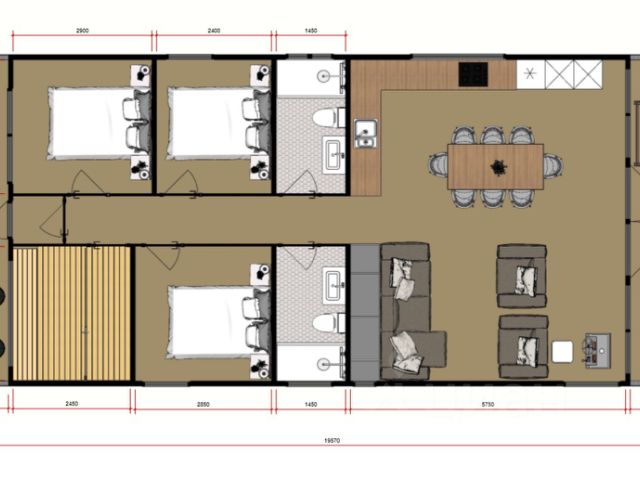 Первый этаж - прихожая с гардеробной, кухня, столовая с выходом на веранду, спортивный зал(зимний сад), гостиная с камином, холодильная комната, гостевой с/у, бассейн с душевой и с/у, гараж.