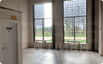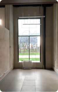 Светлое помещение с большими витринными окнами и высокими потолками.