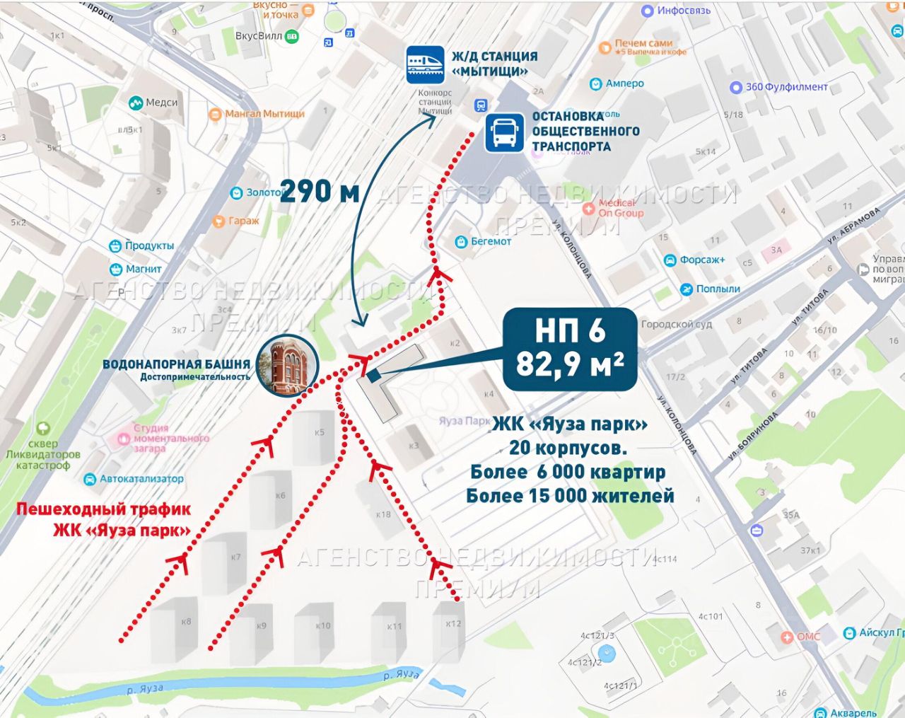 Помещение расположено на первом этаже жилого дома нового ЖК Яуза парк от группы ПИК. ЖК расположен рядом с ж/д станцией Мытищи и будет состоять из 20 жилых корпусов (более 6000 квартир, более 15000 жителей), нескольких детских садов, школы, поликлиники и современных многоэтажных паркингов. Часть квартир продаётся с готовой отделкой, что ускорит процесс заселения.