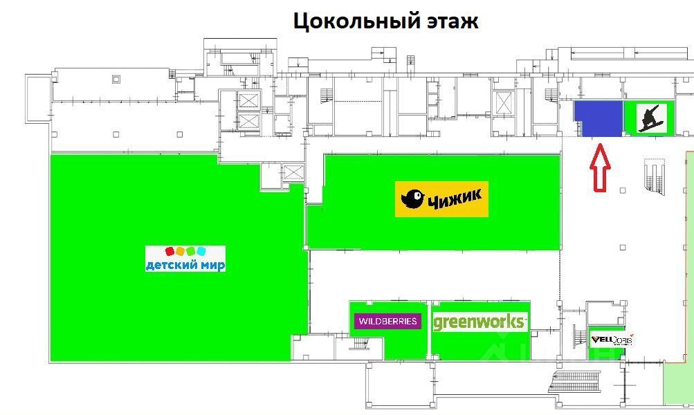 Помещение находится в одном крыле с магазином Чижик и Детский мир и выходит в центральный холл цоколя.