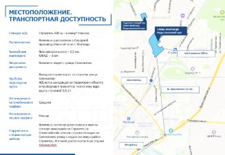 Удобное транспортное расположение: Ярославское шоссе 3,5 км., МКАД 8 км. Въезд автотранспорта со стороны улицы Силикатная. ст. "Строитель" - 5 мин. ст. "Мытищи" - 15 мин.