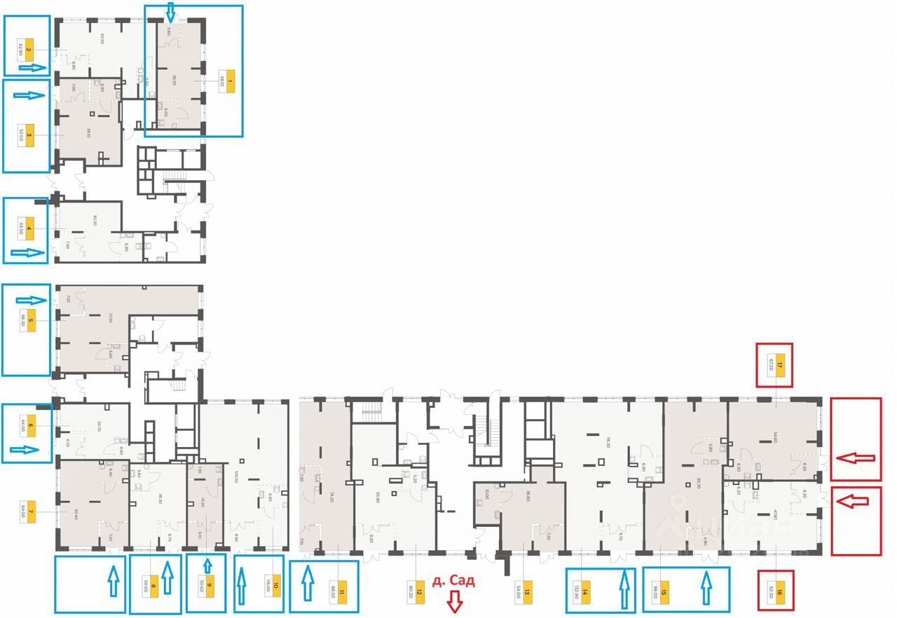 Возможно выбрать любое помещение на плане. Цена будет зависеть от площади и расположения в корпусе.